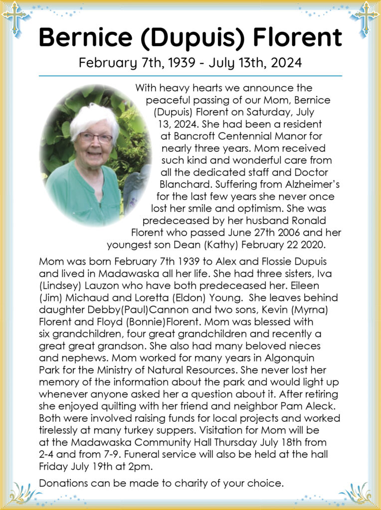 Obituary Bernice (Dupuis) Florent Derek Layman July 13, 2024 About the Author Derek Layman Administrator Visit Website View All Posts Post navigation Previous: William (Bill) Ralph SchweigNext: Hayes, Sharon Anne (Laird) Leave a ReplyYou must be logged in to post a comment. Related News Obituary Jeanette Stoppa The Valley Gazette February 13, 2026 Obituary Kmith, Frederick John The Valley Gazette February 2, 2026 Obituary Florent, Joan Martha (August) The Valley Gazette January 28, 2026