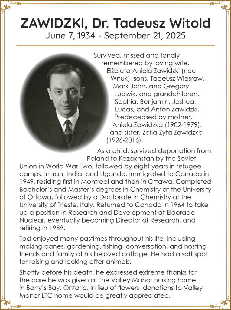 Obituary ZAWIDZKI, Dr. Tadeusz Witold The Valley Gazette September 21, 2025 About the Author The Valley Gazette Administrator View All Posts Post navigation Previous: Refurbished mural unveiled in BancroftNext: The Valley Gazette – September 24, 2025 Leave a ReplyYou must be logged in to post a comment. Related News Obituary Jeanette Stoppa The Valley Gazette February 13, 2026 Obituary Kmith, Frederick John The Valley Gazette February 2, 2026 Obituary Florent, Joan Martha (August) The Valley Gazette January 28, 2026